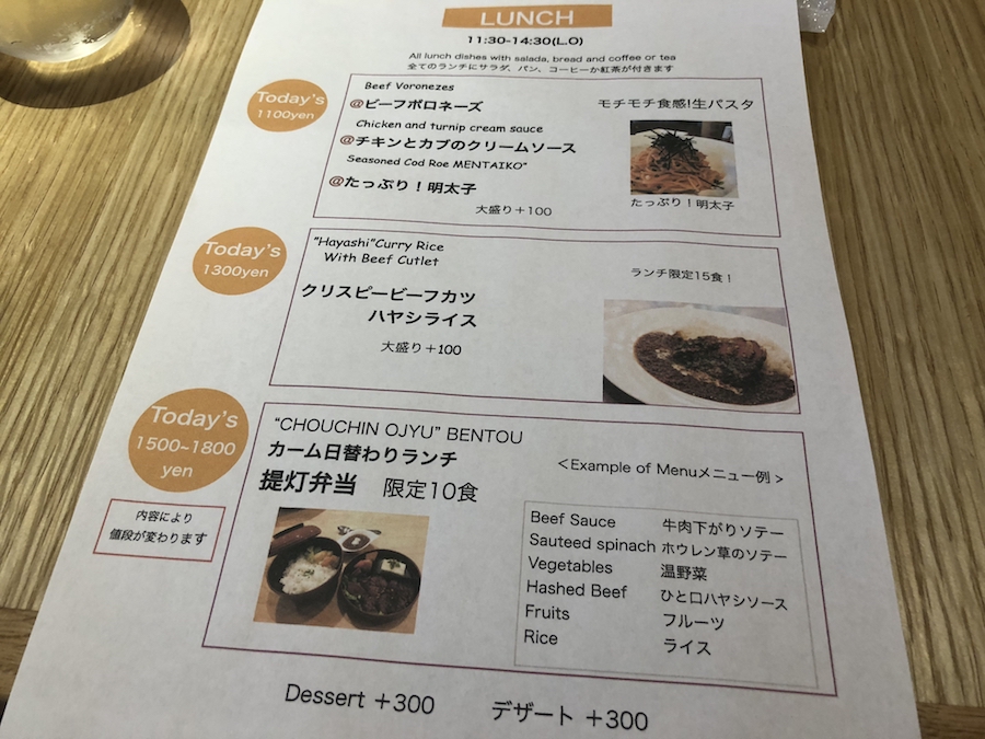 メニューはパスタ、クリスピービーフカツハヤシライス、提灯弁当と3種類だけなのだが、そのうち二つが限定ランチ。
