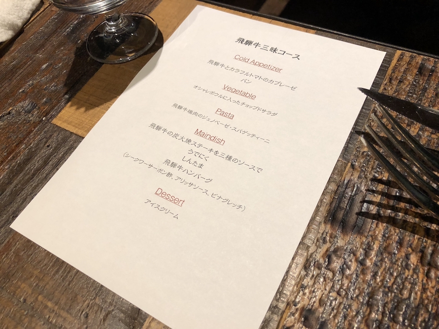 「飛騨牛のカプレーゼ&飛騨牛の炭火焼き&飛騨牛のハンバーグなど飛騨牛三昧!」というなんとも魅力的なコースを発見。