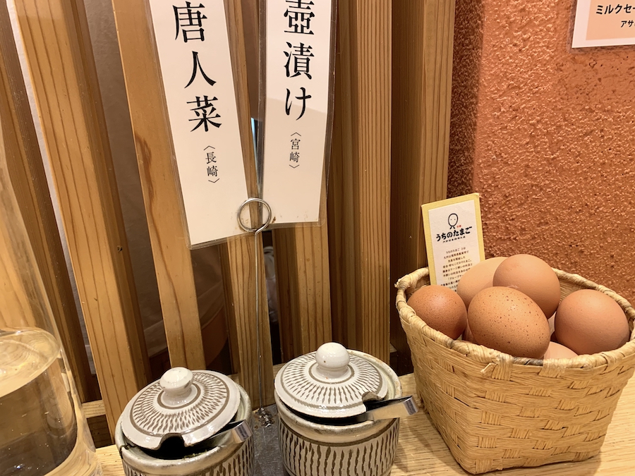 テーブルには卵と漬物。そして数種類の醤油が置かれている。