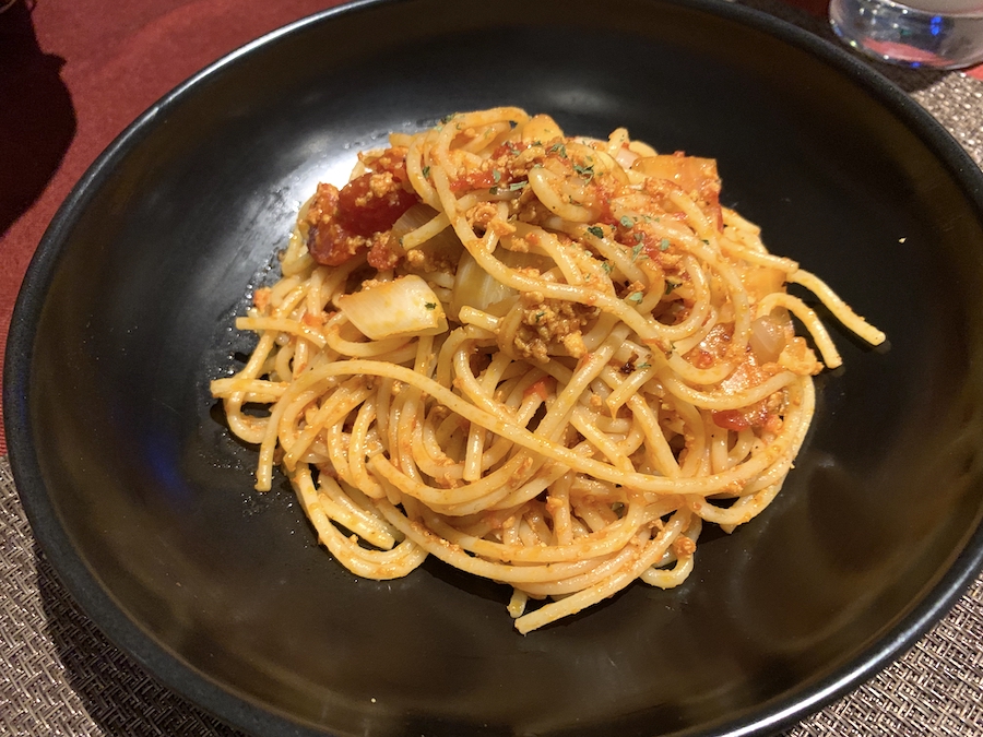 ナンの後にパスタというなかなかヘビーな流れだが、こちらもまたチョイ辛の味付けが食欲を誘う。